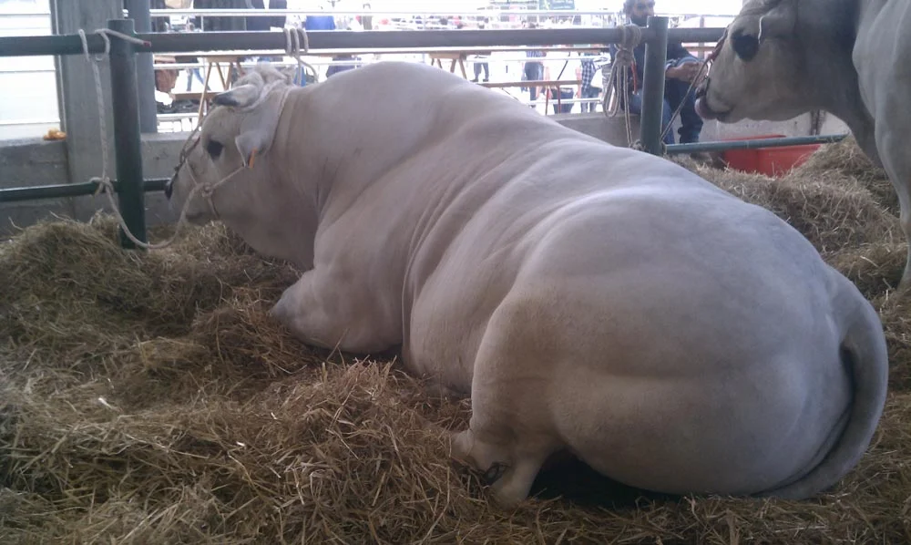 Up close, the Marchigiana is a regal animal, with creamy white hair and eye-popping musculature. The animals are valued for the milk they produce, but especially for their meat. An animal like the one in the picture below ought to produce a good steak or two (hundred).**